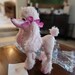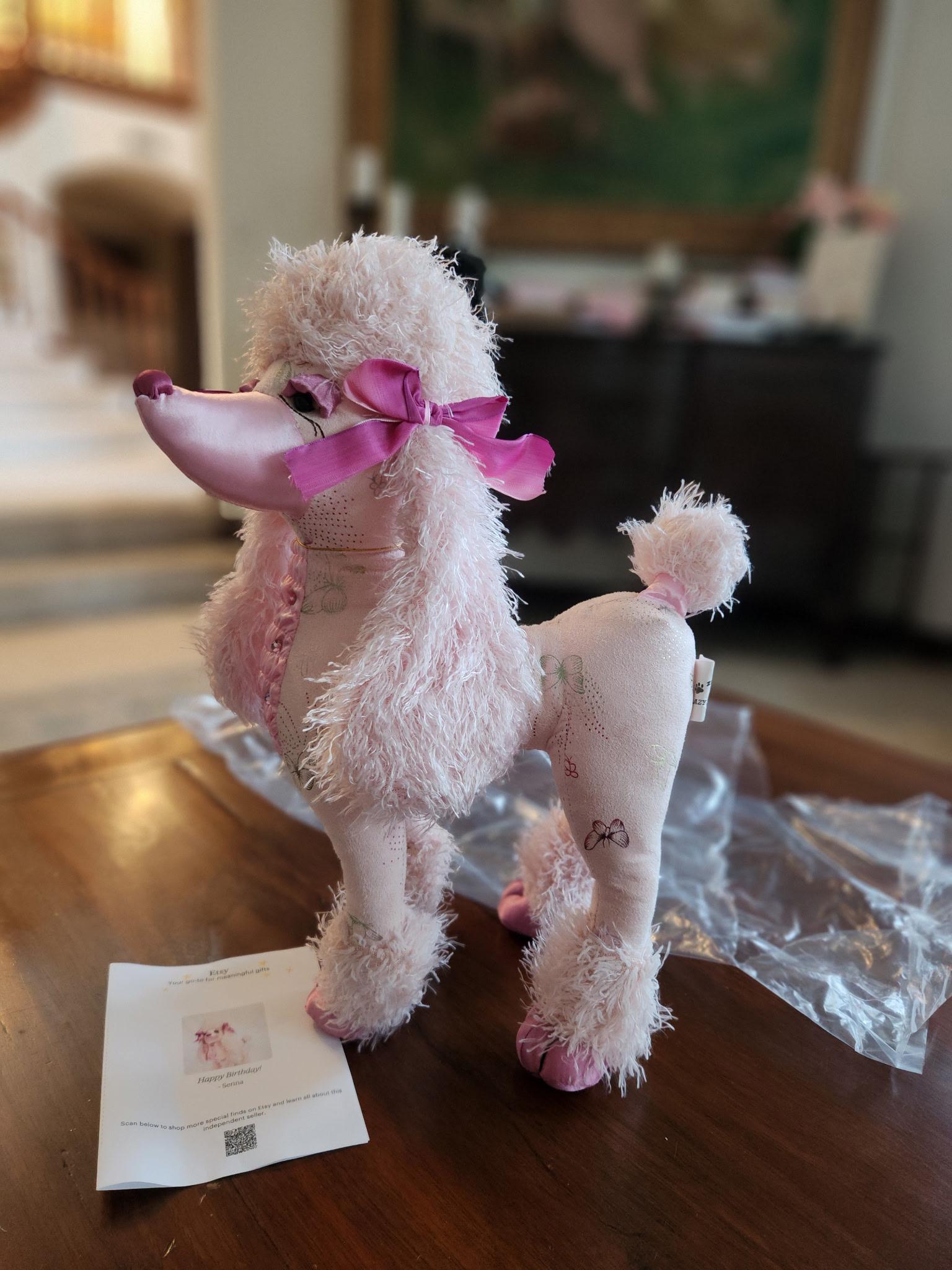 Whimsical pink poodle made with holographic butterfly, faux suede fabric with satin paws and facial features.