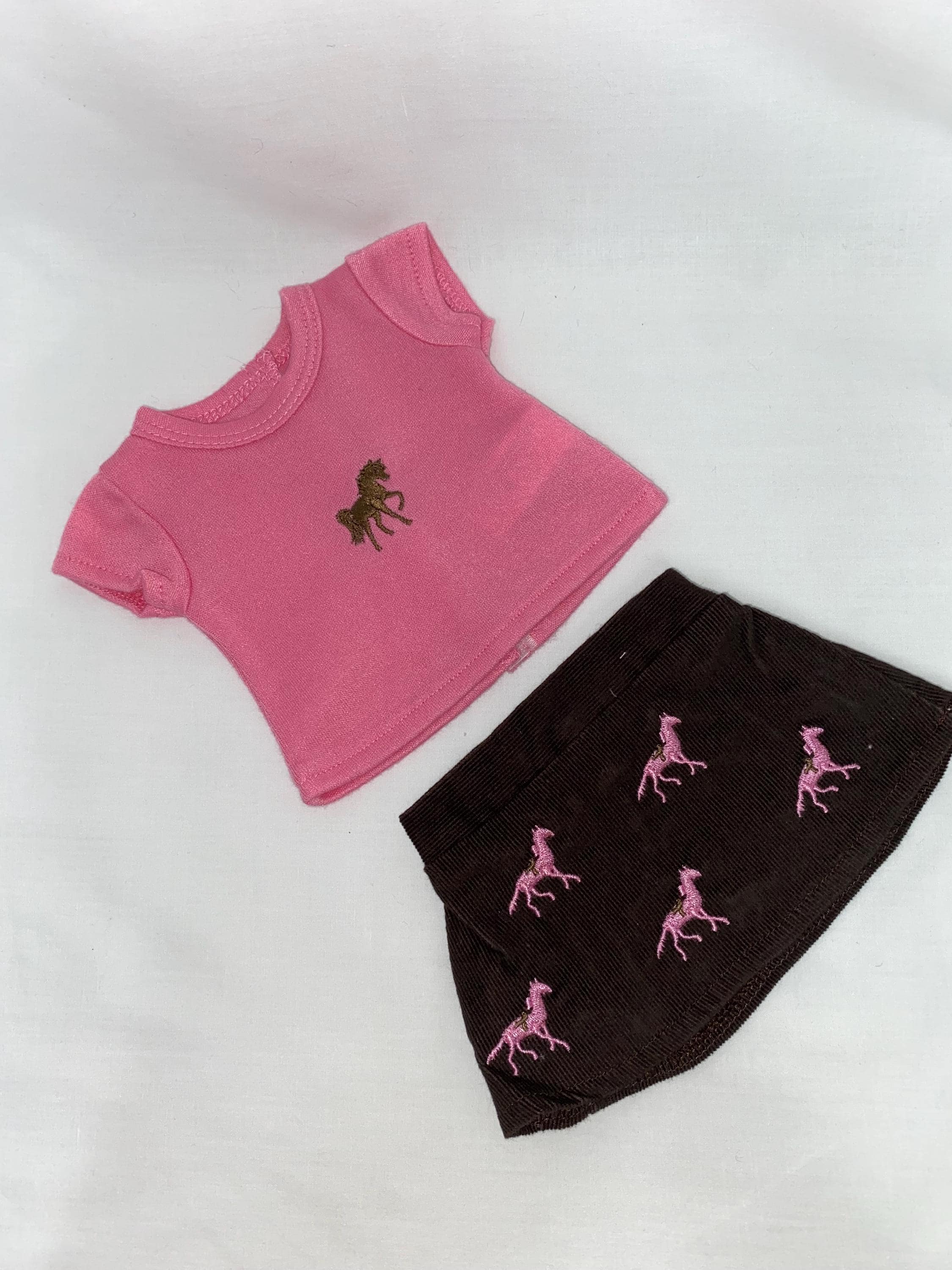 - Brown corduroy skirt with pink contrast embroidery