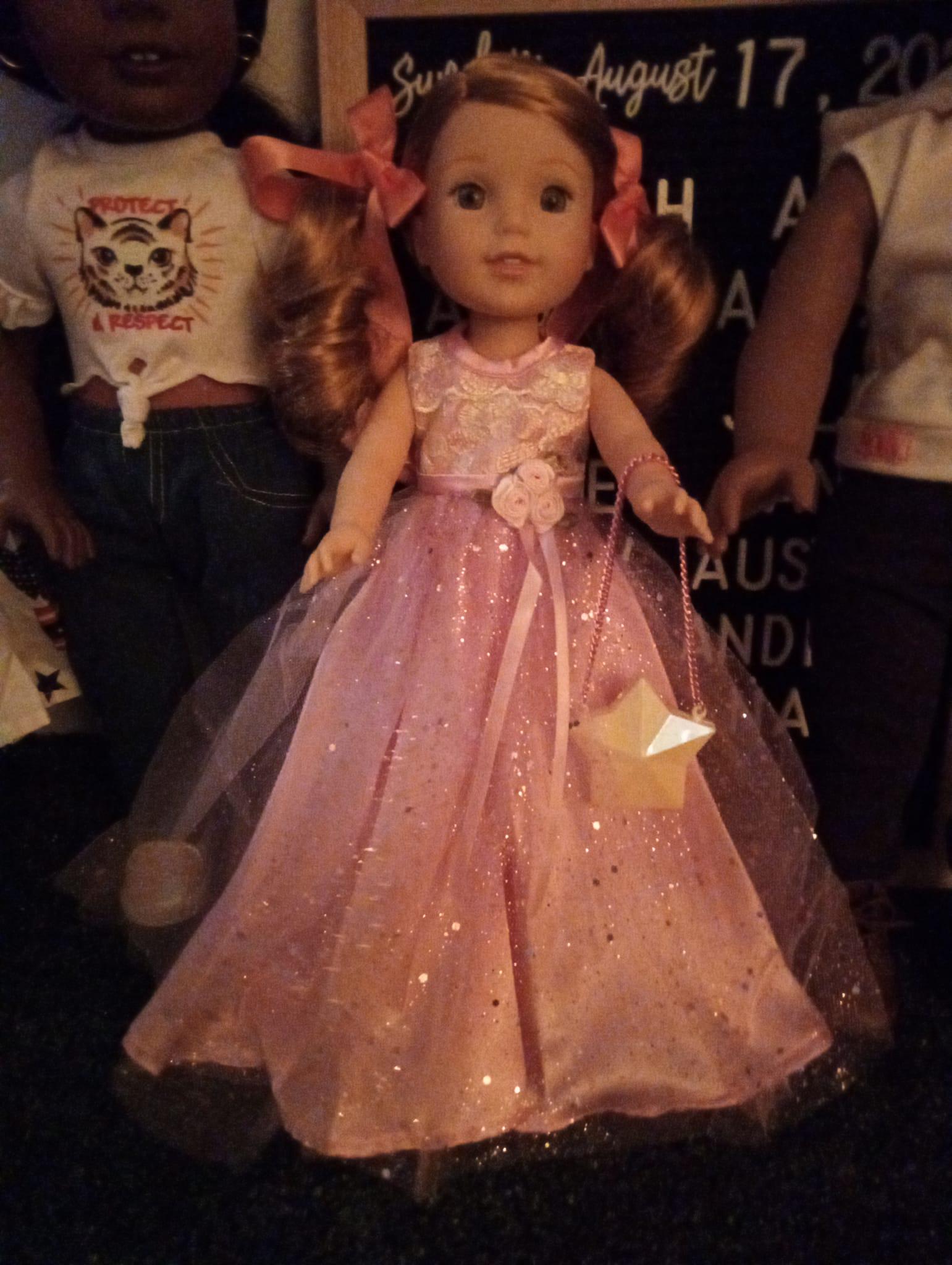 - Pink satin dress with lace overlay top and glitter tulle skirt