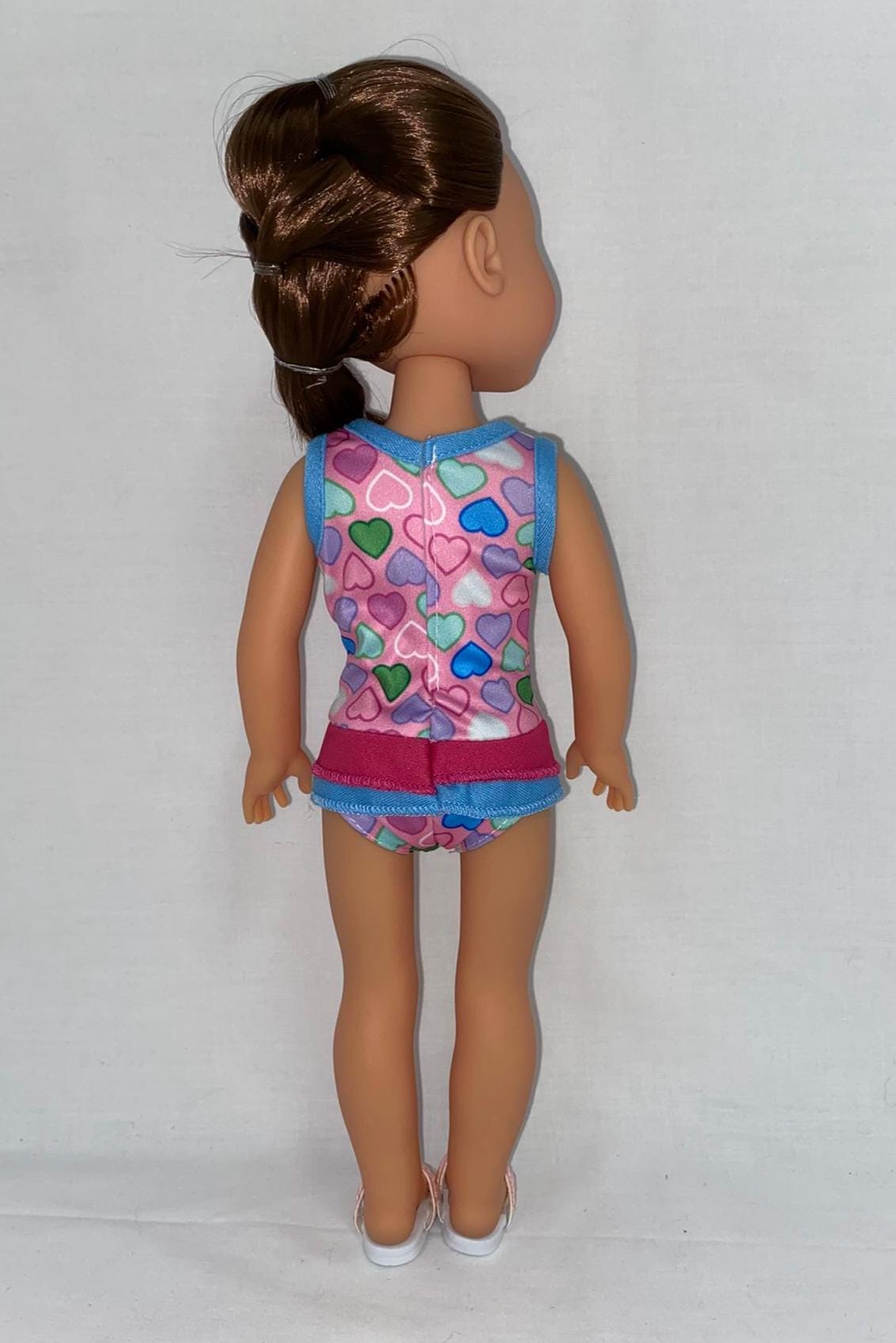 - Pink swimsuit with multi-color hearts pattern and double layer ruffle