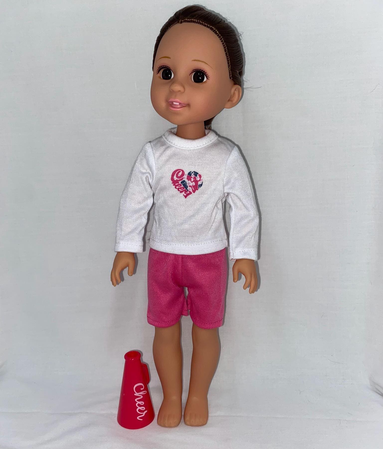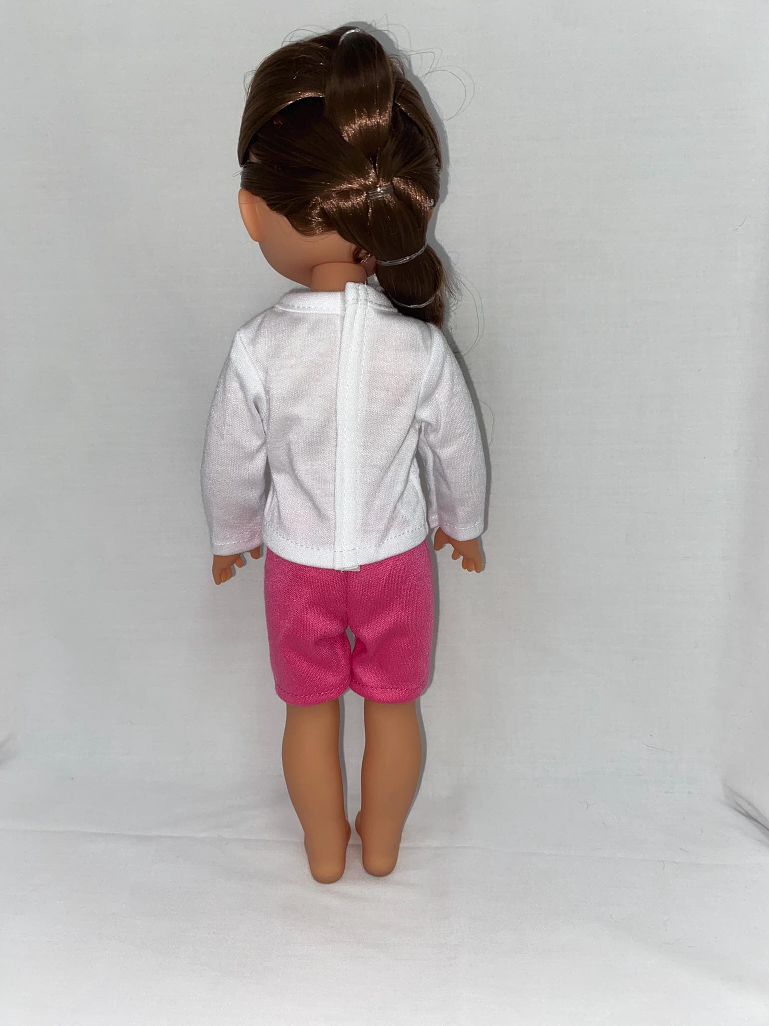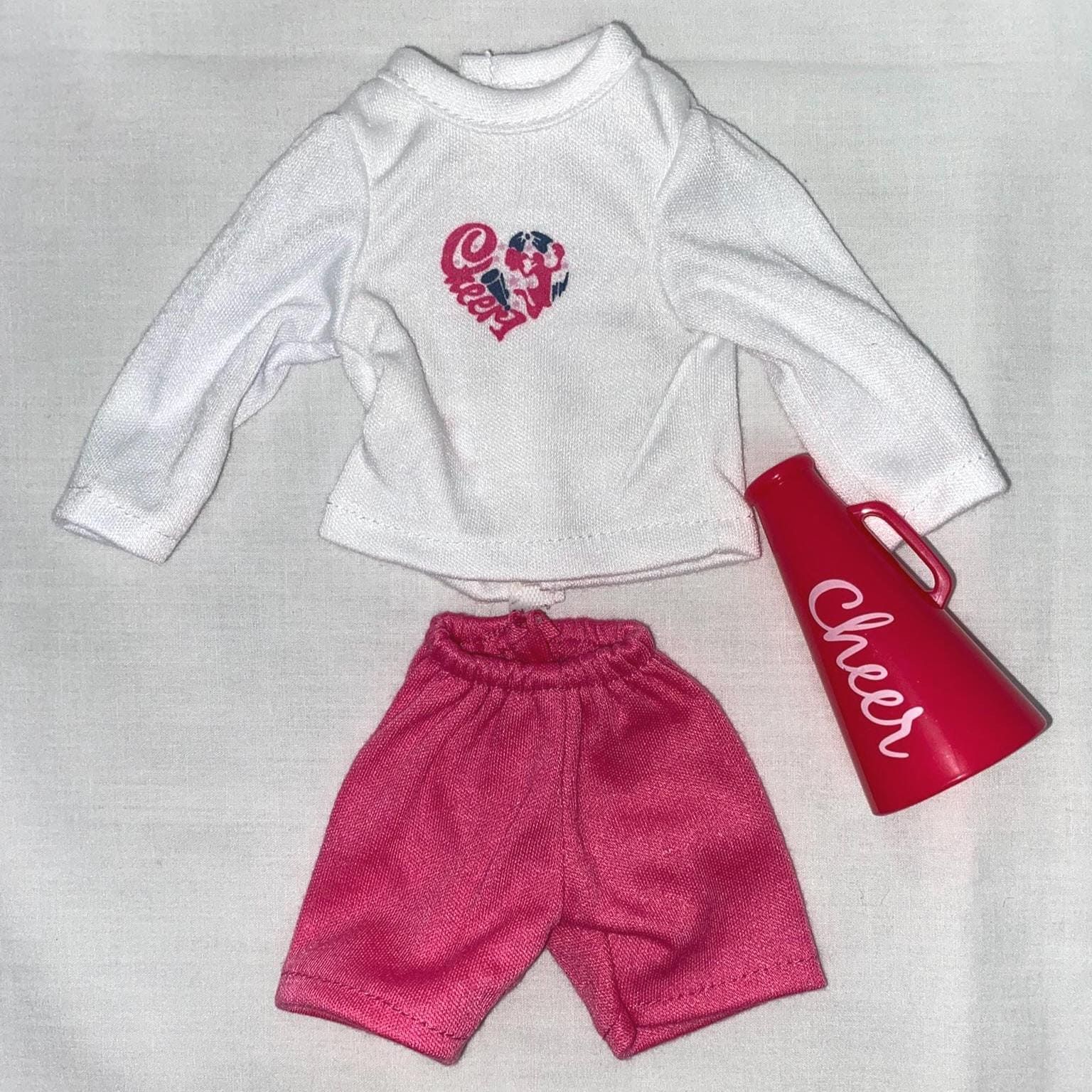 - Hot pink and white SHORT sleeve top with "Love Cheer" graphic with Velcro closure