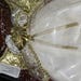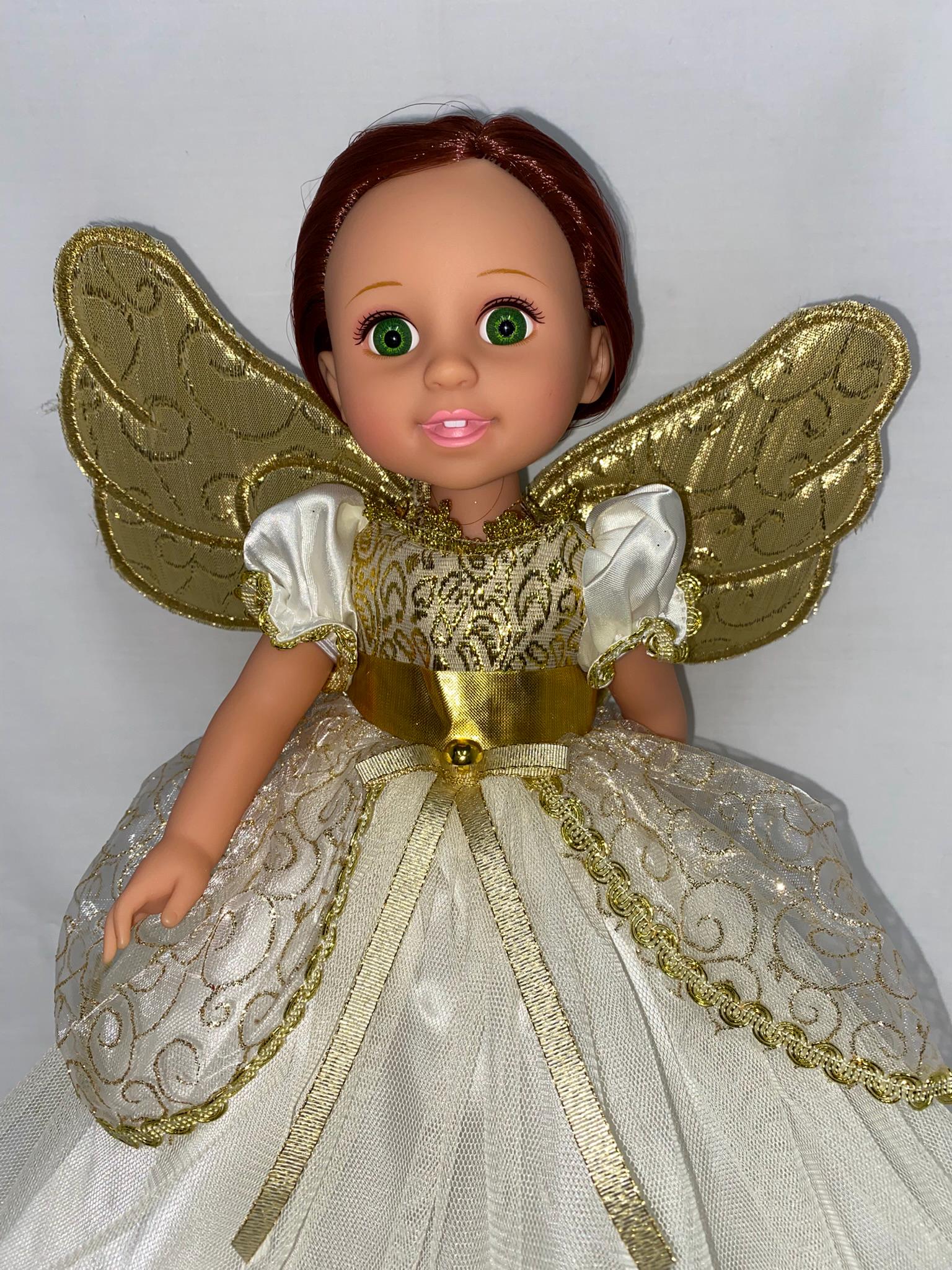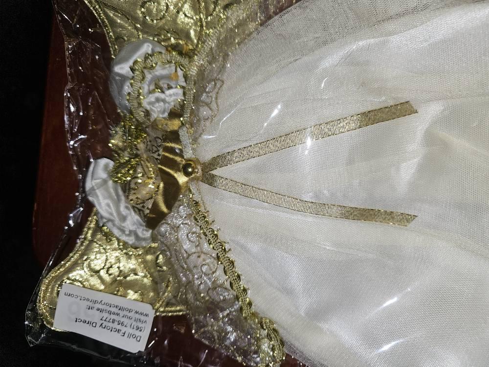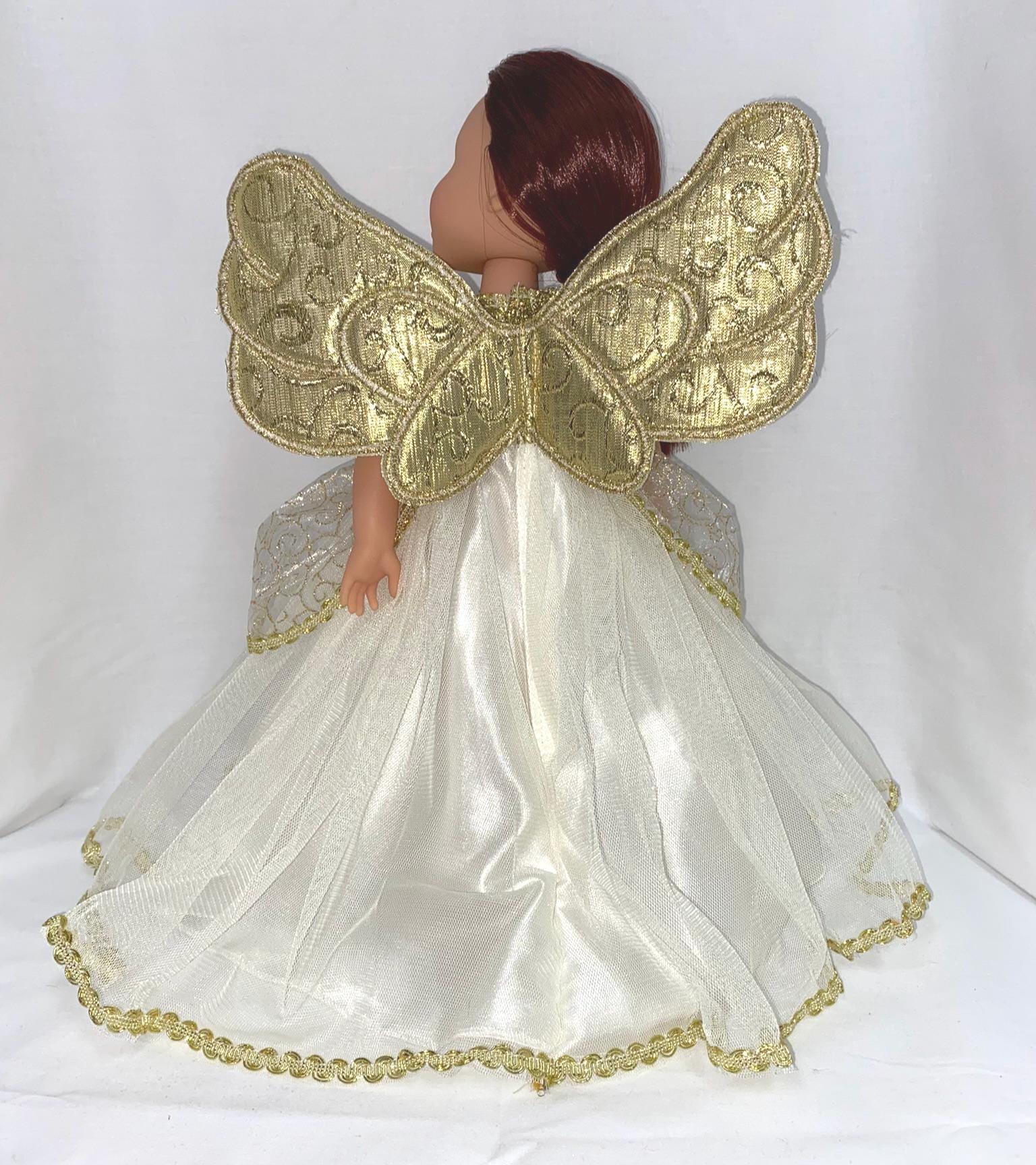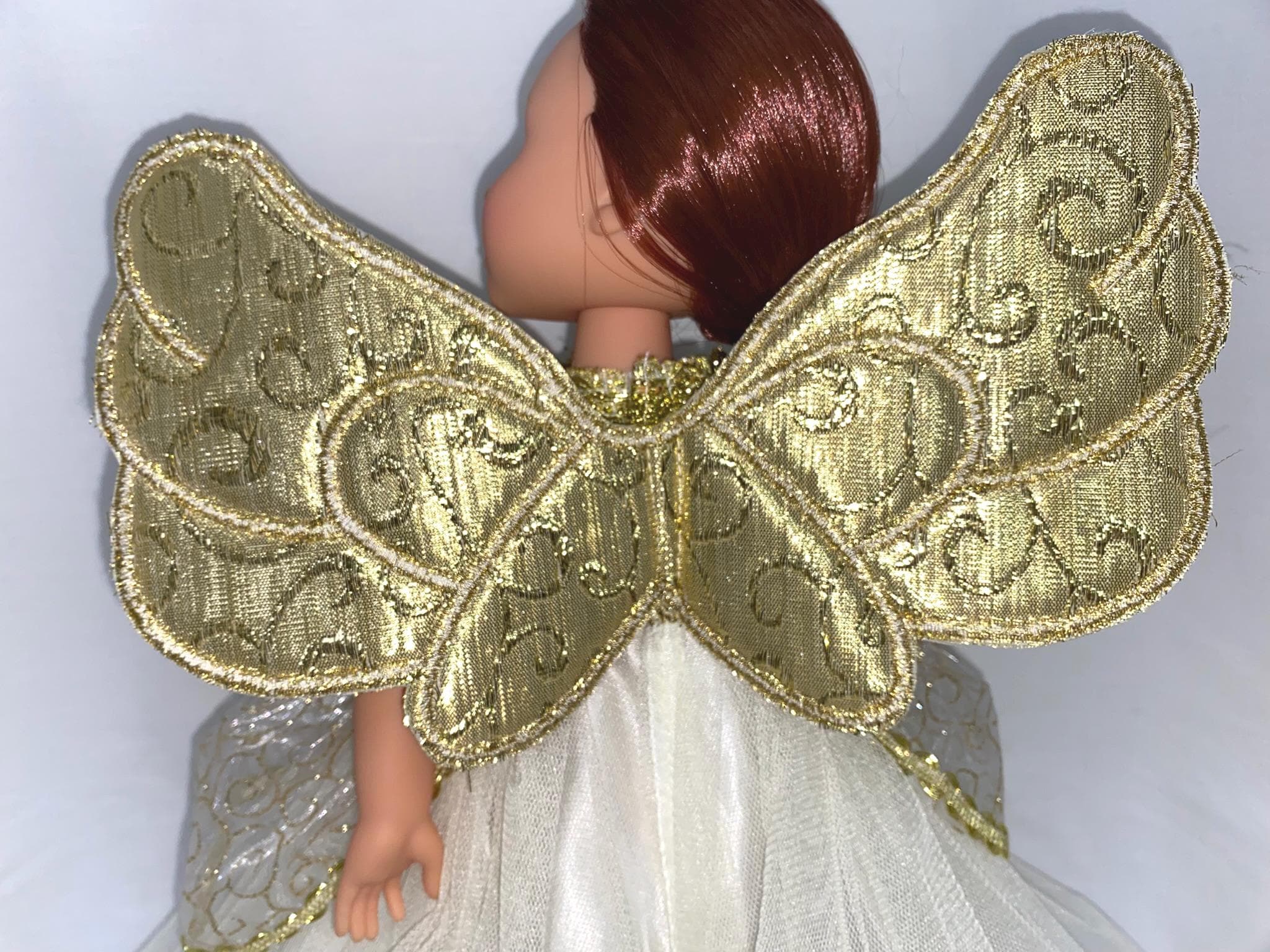 - Ivory and gold dress with attached wings, puff sleeves and glittering overlay on skirt portion.