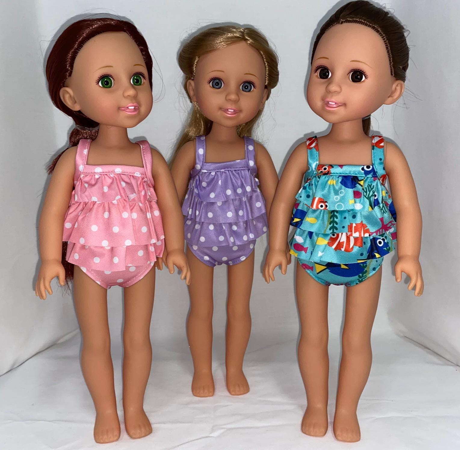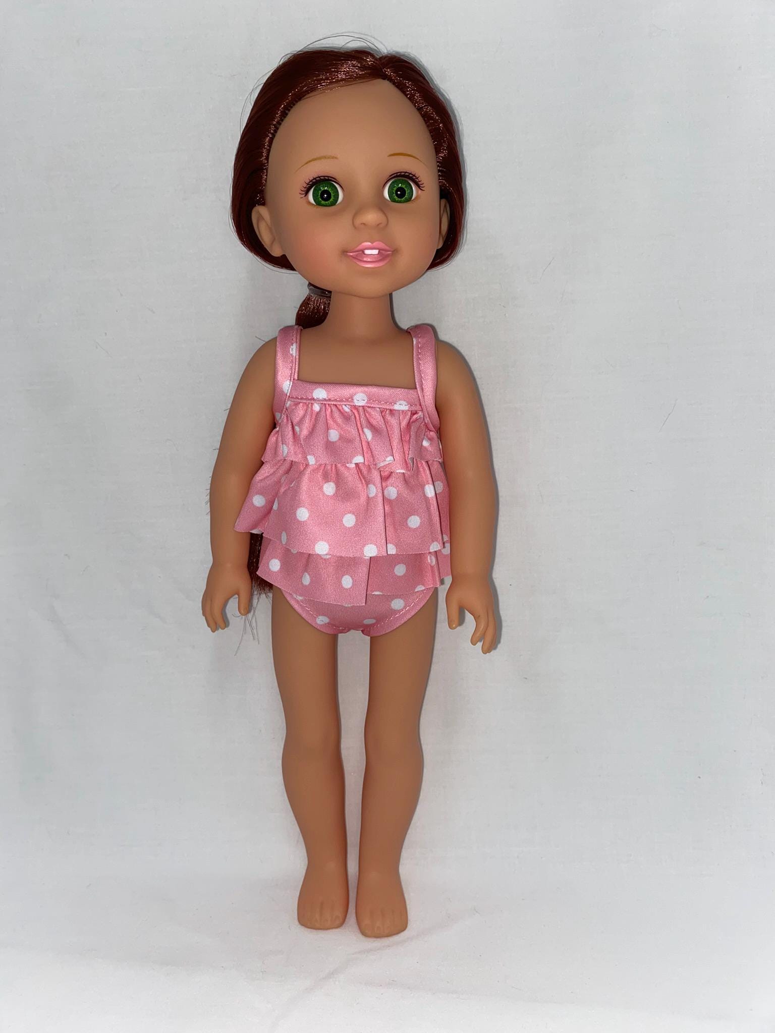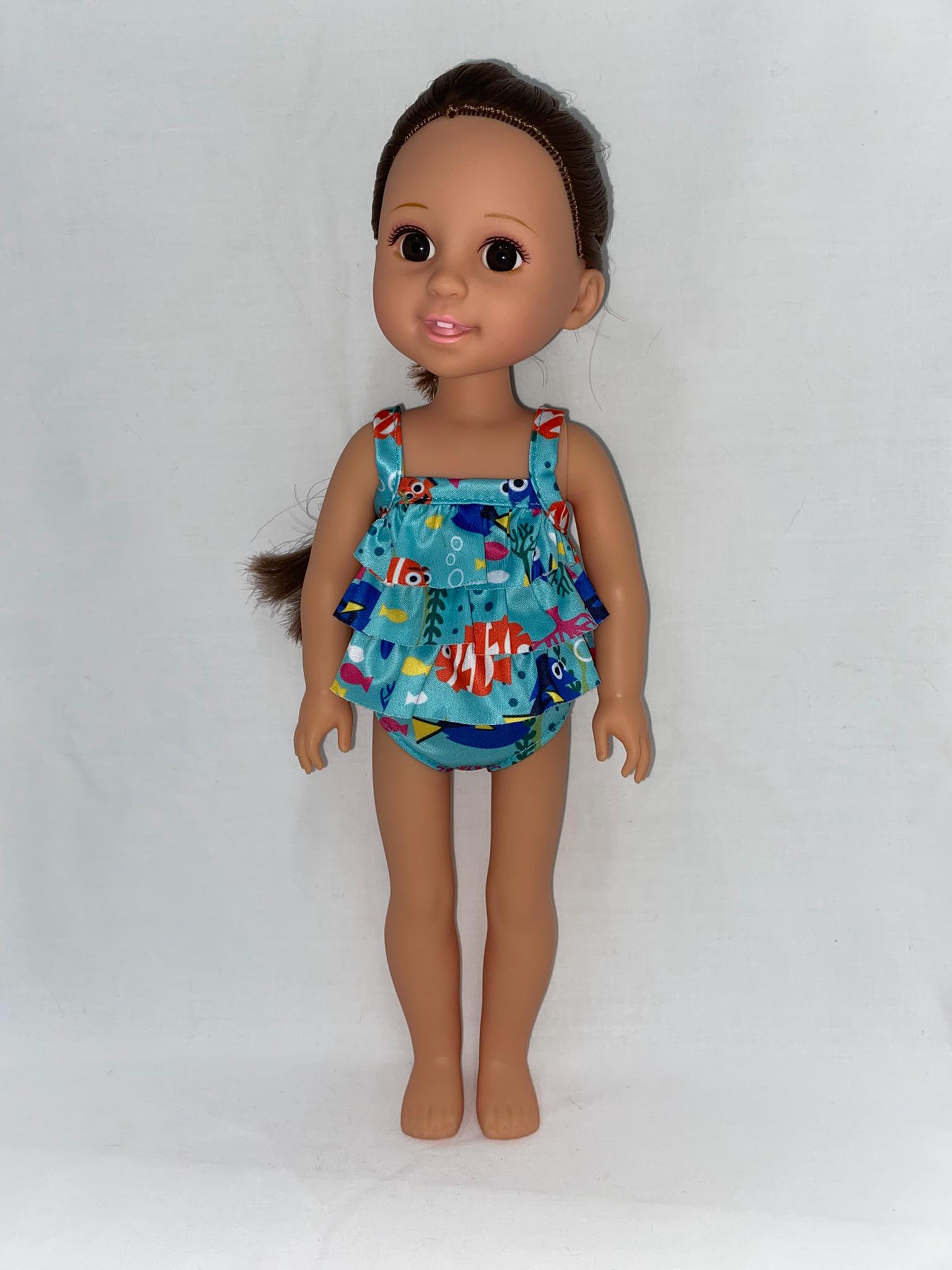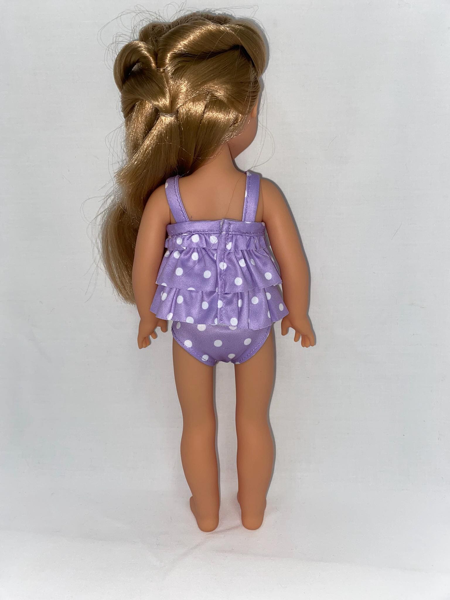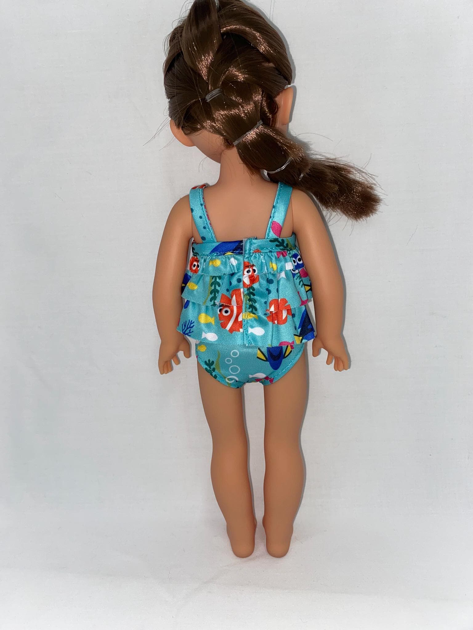 - Choice of pink polka dot, lavender polka dot, or aqua fish print 2 pc.swimsuit